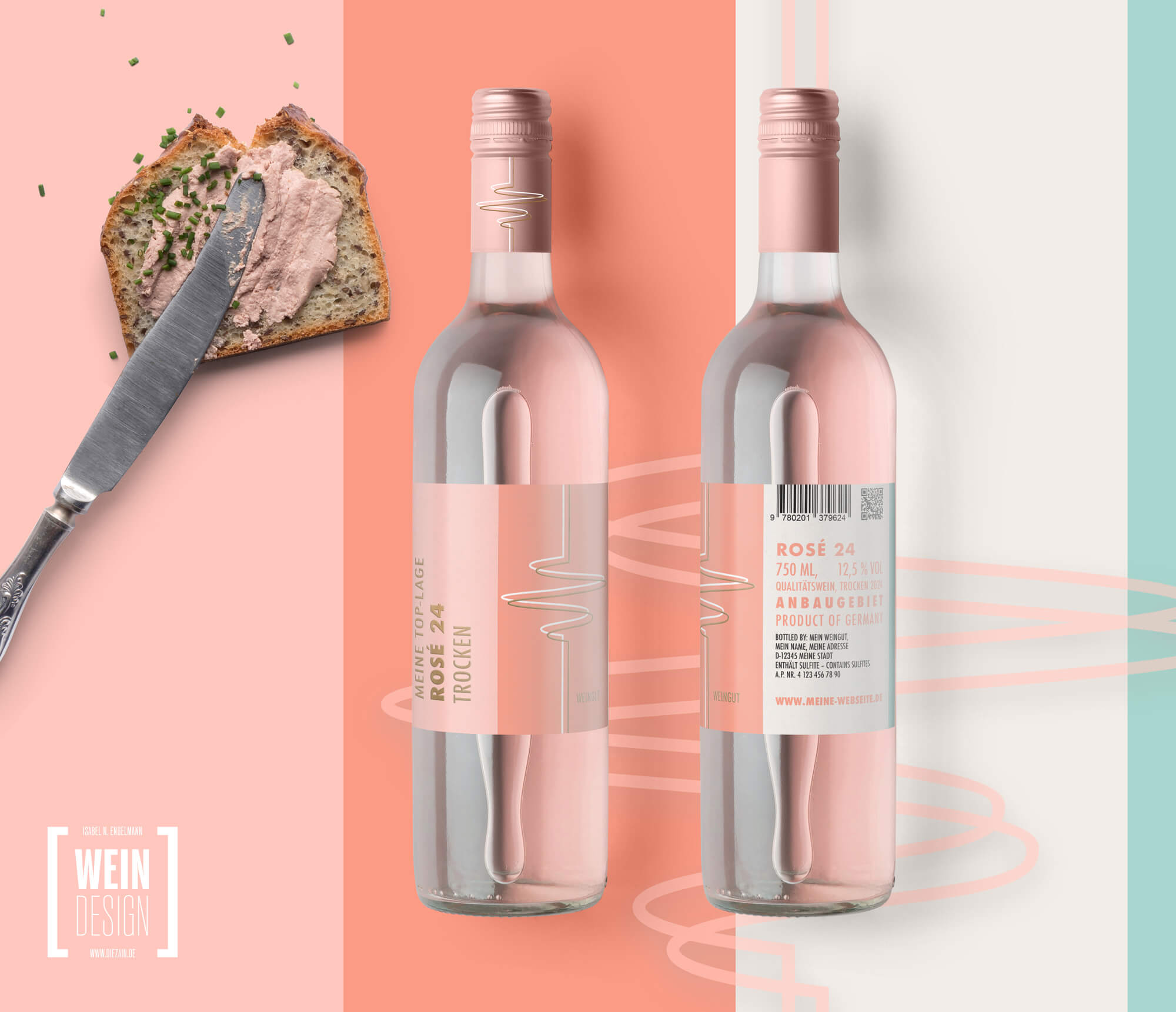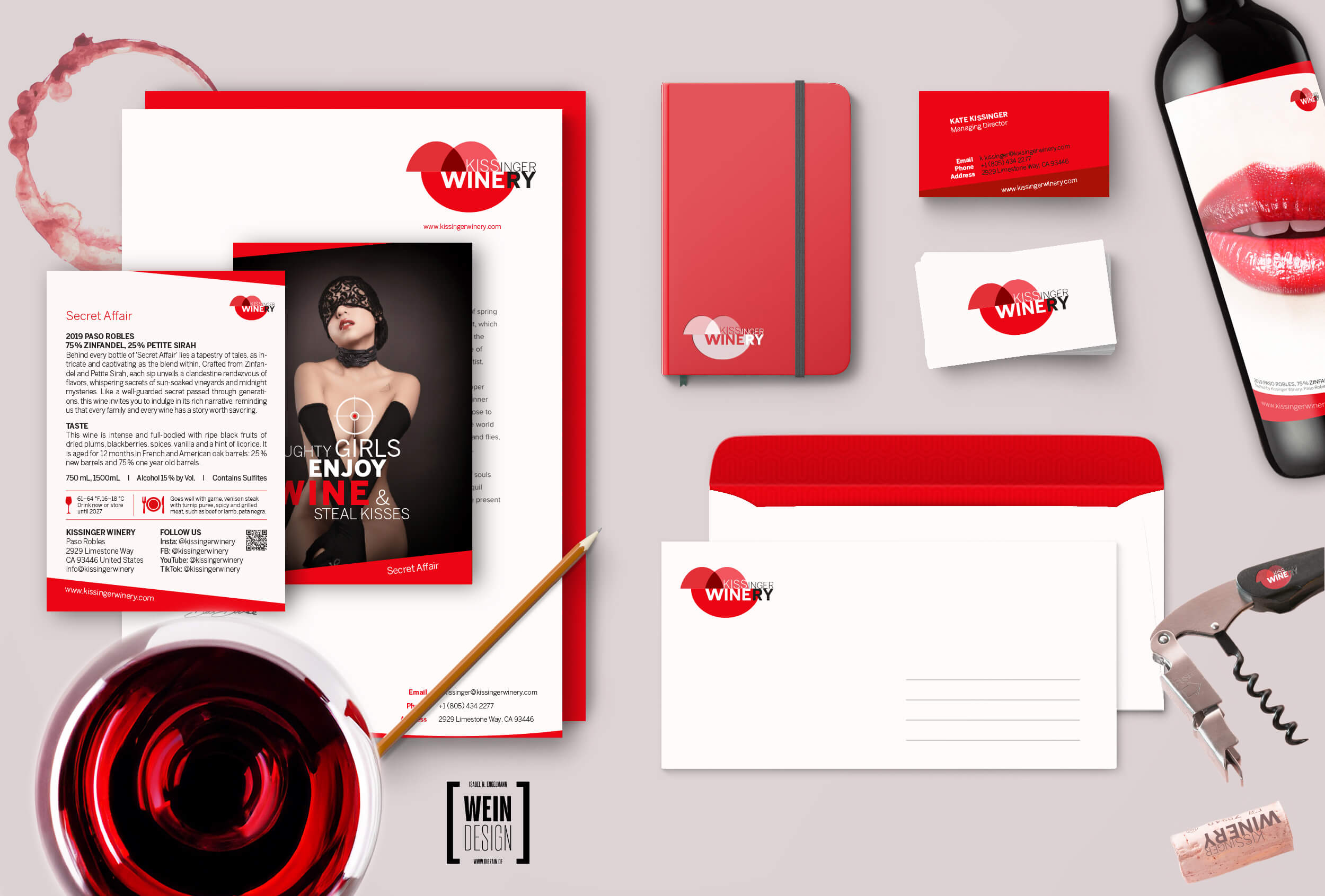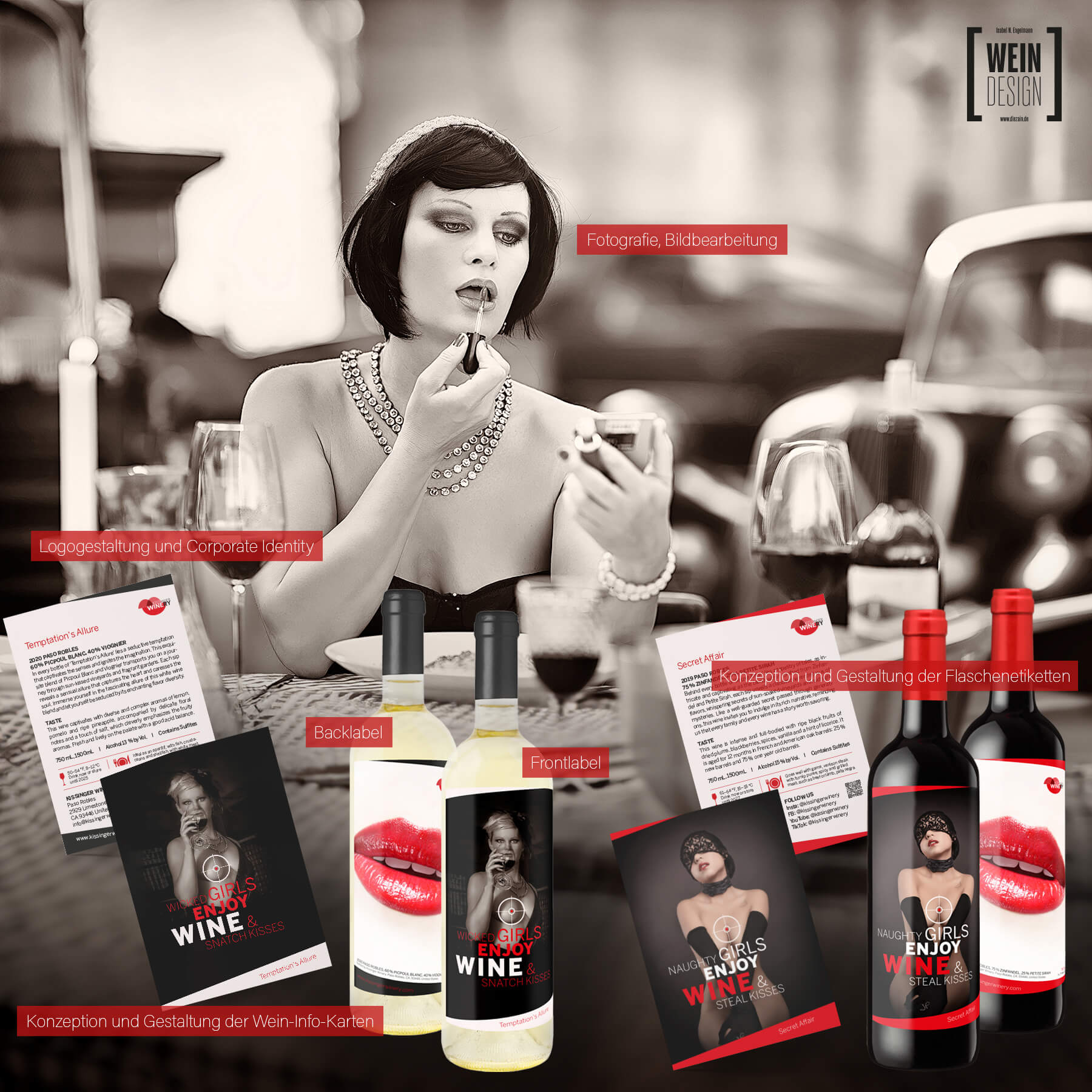Sexy und Provokant. Konzeption und Gestaltung des Logos, der Label, Fotos für Labels (inkl. Fotoshooting, Bildbearbeitung), Gestaltung der Geschäftsausstattung (Briefbögen, Visitenkarten, Briefumschläge, Informationskarten zu den Weinen (Postkartenformat A6), Konzeption und Gestaltung der Webseite.